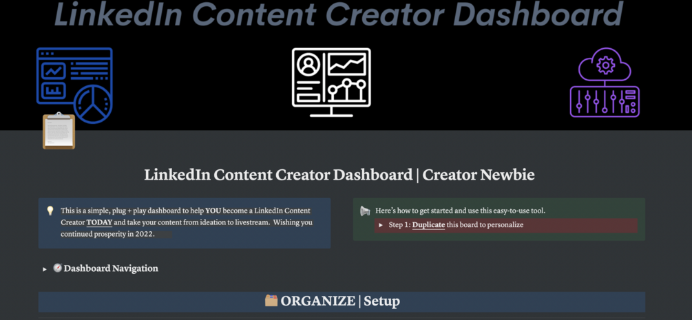 The "LinkedIn Content Creator Dashboard | Creator Newbie" was made for YOU so you can simply: